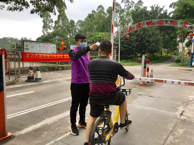 退役在校大學(xué)生何波堅(jiān)守疫情防控一線 被評(píng)為五桂山十佳志愿服務(wù)明星  何波在小區(qū)門崗測(cè)量體溫。