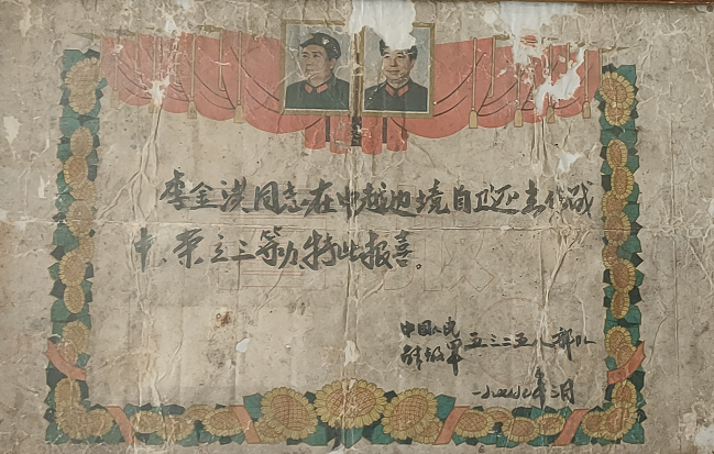 1976年2月,李金洪(第一排右二)春季應(yīng)征入伍大合照 炮火洗禮,浴血奮戰(zhàn) 1979年2月17日,天還未亮,中越邊境線(xiàn)上萬(wàn)炮齊發(fā),漆黑的天空霎時(shí)被炮火染紅。震耳欲聾的炮火聲、沖鋒陷陣的吶喊聲如同驚雷般在李金洪耳邊炸響,令他熱血沸騰,一片空白的腦海瞬間被浴血?dú)场Z取勝利的斗志填滿(mǎn)。 這是李金洪作為53258部隊(duì)尖刀班機(jī)槍手參加1979年對(duì)越自衛(wèi)反擊戰(zhàn)的記憶。當(dāng)時(shí),尖刀班肩負(fù)著沖在隊(duì)伍最前方、為主力部隊(duì)擋下槍炮等最為急難險(xiǎn)重的任務(wù)。 從2月17日到3月16日,從靠松山到三埡口,在持續(xù)一個(gè)月的山地戰(zhàn)爭(zhēng)中,李金洪和戰(zhàn)友們每天僅靠吃干糧野果、喝河水充饑,整整一個(gè)月的時(shí)間里衣服干了又濕,濕了又干,有時(shí)受傷之后,傷口和衣服都粘在一起,疼痛無(wú)比。當(dāng)時(shí)雖然又累又困,但是戰(zhàn)士們的眼睛始終都是保持睜開(kāi)的,因?yàn)閿橙穗S時(shí)都會(huì)出現(xiàn)在附近,瞬間就是你死我活的戰(zhàn)場(chǎng)。就這樣,李金洪一直以堅(jiān)定信念和頑強(qiáng)精神在戰(zhàn)場(chǎng)殺敵,直到戰(zhàn)爭(zhēng)結(jié)束。 生死一瞬間,火線(xiàn)立軍功 1979年3月10日,尖刀班接到了去三埡口搜山的任務(wù),突然與敵軍遭遇,當(dāng)時(shí)尖刀班只配備了一挺機(jī)槍?zhuān)罱鸷榫褪菣C(jī)槍手,當(dāng)時(shí)由于地形對(duì)我方不利,不便發(fā)動(dòng)火力打擊和進(jìn)行蔭蔽工作。這時(shí),班長(zhǎng)一邊指揮2名戰(zhàn)士立即下山給后方的大部隊(duì)報(bào)信,一邊組織全班沉著埋伏,等待敵人靠近。 當(dāng)敵人離陣地只有幾米時(shí),作為班里唯一機(jī)槍手的李金洪突然挺起機(jī)槍準(zhǔn)備開(kāi)火,敵軍看到機(jī)槍慌亂朝他射擊,李金洪迅速閃躲,避開(kāi)飛來(lái)的子彈,隨即向敵人開(kāi)火,首發(fā)即擊斃領(lǐng)頭敵軍,并成功搶占有利地形,用猛烈的火力掩護(hù)全班戰(zhàn)斗,敵人四處逃竄。 僅用半小時(shí),尖刀班就消滅了4名敵人、俘虜1名,繳獲半自動(dòng)步槍2支,并且全班無(wú)一人員傷亡,打下一場(chǎng)漂亮的伏擊戰(zhàn)??克缮健|溪、高平、茶靈、廣淵、下瑯……對(duì)越自衛(wèi)反擊戰(zhàn)期間,李金洪保家衛(wèi)國(guó)浴血奮戰(zhàn),出色地完成了上級(jí)交給的護(hù)衛(wèi)和戰(zhàn)斗任務(wù),榮立個(gè)人三等功1次。