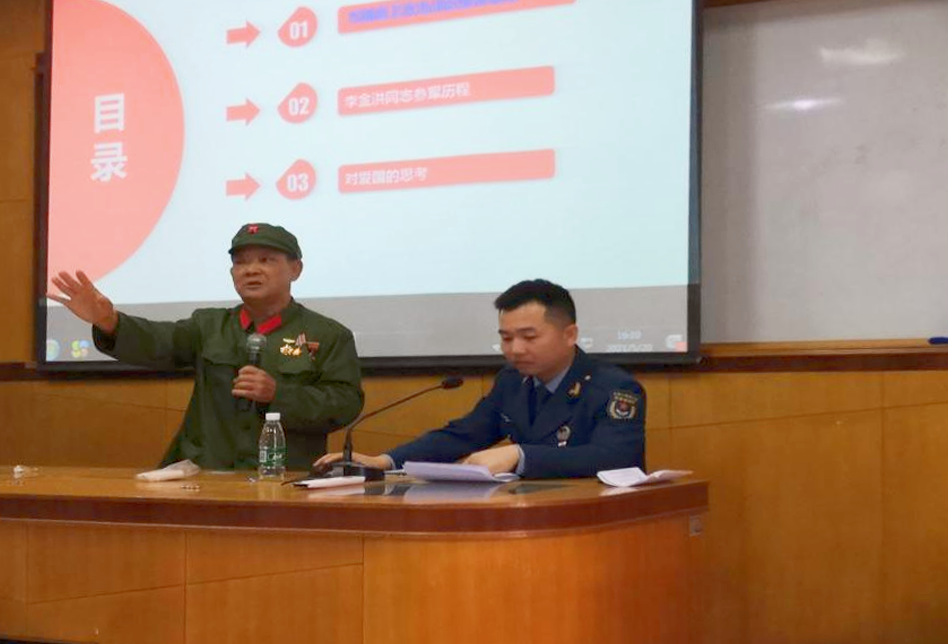 戰(zhàn)后李金洪(第四排左四)與全連戰(zhàn)友合影 愛(ài)國(guó)主義教育的紅旗志愿者 無(wú)論是在戰(zhàn)場(chǎng)上還是在和平年代,無(wú)論是身在部隊(duì)還是脫下軍裝,李金洪都始終保持著軍人的作風(fēng),也始終堅(jiān)守著忠于祖國(guó)、熱愛(ài)人民的精神信仰。李金洪不忘初心、牢記使命,用實(shí)際行動(dòng)詮釋了“退伍不褪色、退役不退志、離軍不離黨”的退役軍人品質(zhì)。 在建黨100周年舉國(guó)同歡的日子里,李金洪受邀參加神灣鎮(zhèn)“老黨員講黨史,憶崢嶸感黨恩”主題活動(dòng)?;顒?dòng)上,李金洪以“我和我的祖國(guó)”為題與神灣中學(xué)915名師生共同回憶1979年那段崢嶸歲月,講述了為捍衛(wèi)國(guó)家和人民利益而進(jìn)行的無(wú)畏戰(zhàn)斗,在場(chǎng)師生無(wú)不為之動(dòng)容,深感到今日幸福生活來(lái)之不易。 由于身體患病,李金洪說(shuō)起話(huà)來(lái)不是很連貫,甚至不能長(zhǎng)時(shí)間說(shuō)話(huà)。但他義無(wú)反顧的接受邀請(qǐng),成為愛(ài)國(guó)主義教育的紅旗志愿者,目的是為了讓年輕一代更加熱愛(ài)祖國(guó)、熱愛(ài)人民和熱愛(ài)生活。