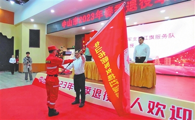 中山市人民政府副市長曾奕給中山市擁軍支前紅旗服務(wù)隊授旗。      楊啟寧 攝