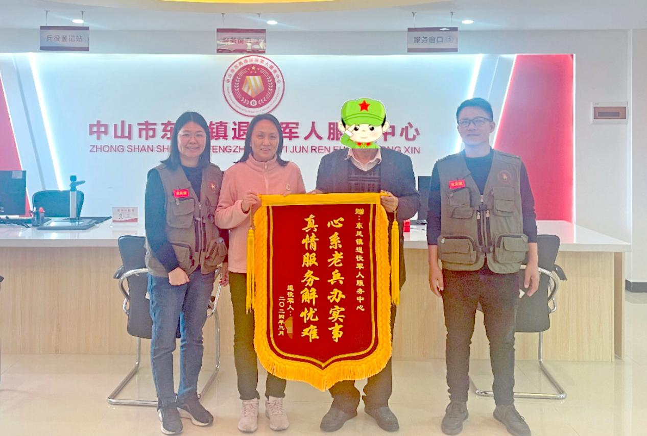 3月19日,中山市東鳳鎮(zhèn)小瀝社區(qū)退役軍人朱叔懷著感激之情,將一面印有“心系老兵辦實事,真情服務(wù)解憂難”的錦旗送到東鳳鎮(zhèn)退役軍人服務(wù)中心,感謝該中心幫助其分別成功申請到廣東省應(yīng)急救助資金和中山市臨時困難補助,解決了他的燃眉之急,緩解了家庭困難。  退役軍人朱叔將一面印有“心系老兵辦實事,真情服務(wù)解憂難”的錦旗送到東鳳鎮(zhèn)退役軍人服務(wù)中心。通訊員供圖