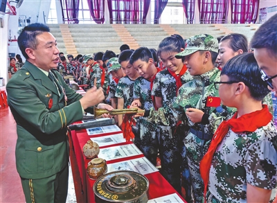 “這個(gè)‘移動(dòng)軍旅展覽館’里每一件物品都是父輩在抗戰(zhàn)時(shí)期、解放戰(zhàn)爭為國奮斗一生的追憶,也是軍人們在戰(zhàn)爭中流汗流血、立下赫赫戰(zhàn)功的印記?!碧怪捩?zhèn)林東小學(xué)的同學(xué)們在“開學(xué)第一課堂”上一邊觀賞參戰(zhàn)展品,一邊聆聽著老兵宣講員講述的紅色故事,仿佛置身于當(dāng)年的行軍場景之中。
