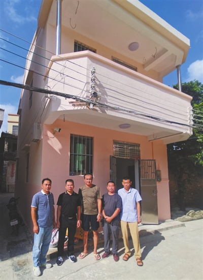 余林鋒(中)和南朗街道退役軍人服務(wù)中心工作人員在改造后的房屋前。通訊員供圖