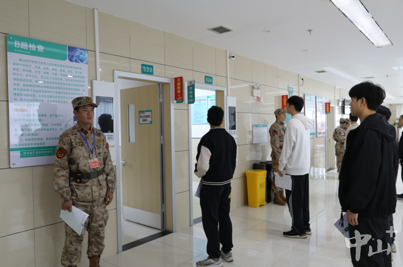 1月20日,中山市2024年上半年征兵體檢在火炬開(kāi)發(fā)區(qū)人民醫(yī)院開(kāi)啟,預(yù)計(jì)體檢時(shí)間將持續(xù)2周以上。 早上7時(shí)許,在火炬開(kāi)發(fā)區(qū)人民醫(yī)院門(mén)診五樓,中山市征兵辦工作人員對(duì)照名冊(cè)開(kāi)始人員清點(diǎn)。中山市征兵體檢隊(duì)總檢醫(yī)生李燦永介紹,此次征兵體檢面向全市所有鎮(zhèn)街,上站青年預(yù)計(jì)有1500人左右,其中大學(xué)畢業(yè)生有800人左右。當(dāng)天有100多名大學(xué)畢業(yè)生參加上站體檢,體檢項(xiàng)目有外科、內(nèi)科、心電圖等多個(gè)項(xiàng)目。 應(yīng)征青年排隊(duì)體檢。記者 王云 攝