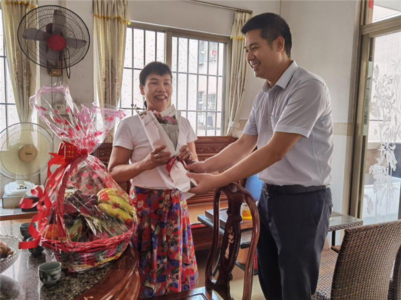 ▲南頭鎮(zhèn)退役軍人服務中心走訪慰問邊防海防現(xiàn)役軍人母親。 每到一戶,南頭鎮(zhèn)退役軍人服務中心主任黃國全都為“兵媽媽”獻上鮮花和果籃,并了解邊防海防現(xiàn)役軍人在部隊的服役情況,以及家屬身體狀況、生活、工作等情況,對她們默默支持孩子為國防建設作貢獻致以崇高的敬意。 “謝謝你們今天專程來看望我,我感到黨和國家對軍人軍屬越來越重視,作為邊防軍人家屬尤其感到驕傲和自豪!我們將一如既往地支持他在邊防站好崗、放好哨,為國防出力!”邊防官兵何財華媽媽說道。 |