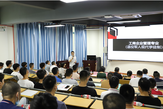 “狹路相逢勇者勝,在座的各位從繁忙的工作崗位上走出來,邁出繼續(xù)學(xué)習(xí)的關(guān)鍵一步,勇氣可嘉。三年后,相信大家一定會收獲知識、技能、學(xué)歷,更好地開啟新征程?!蓖艘圮娙爽F(xiàn)代學(xué)徒制項目開學(xué)典禮上,經(jīng)管學(xué)院院長肖紅在致辭中對新生們表示歡迎和祝賀,并表達了殷切期望,希望大家在求學(xué)期間,修德修身、克勤克儉、心懷理想,腳踏實地,融入多姿多彩的校園生活,在學(xué)生當(dāng)中彰顯軍人本色和榜樣力量。 市退役軍人事務(wù)局相關(guān)負責(zé)人對項目順利開班表示祝賀,對學(xué)院在項目申報、招生等工作中的辛勤付出表示衷心感謝。他介紹了項目實施的背景,指出開展退役軍人現(xiàn)代學(xué)徒制教育,是退役軍人安置工作的一項重要內(nèi)容,通過現(xiàn)代學(xué)徒制,讓大家成為全日制大學(xué)生,進行正規(guī)系統(tǒng)的高等職業(yè)教育,是黨和政府送給同學(xué)們的一份沉甸甸的“大禮包”。同時,要求新生們盡快適應(yīng)由士兵到大學(xué)生的角色轉(zhuǎn)變,勤學(xué)善思,掌握就業(yè)創(chuàng)業(yè)本領(lǐng),發(fā)揚軍隊能打勝仗的優(yōu)良傳統(tǒng),爭創(chuàng)佳績,為祖國和地方經(jīng)濟建設(shè)再立新功。 學(xué)院工商管理專業(yè)主任沈孟康介紹了學(xué)校和學(xué)院概況,就學(xué)生日常管理、教學(xué)內(nèi)容、方式和計劃等作詳細說明。表示學(xué)校將采取在崗培養(yǎng)與學(xué)校培養(yǎng)相結(jié)合,堅持“標(biāo)準(zhǔn)不降、模式多元、學(xué)制靈活”,線上與線下混合教學(xué),實行工學(xué)交替、靈活多元的教學(xué)模式。經(jīng)管學(xué)院已配備了教授、博士等“精銳”師資團,“量身定制”人才培養(yǎng)方案,全力保障“八一班”的教育教學(xué)質(zhì)量。