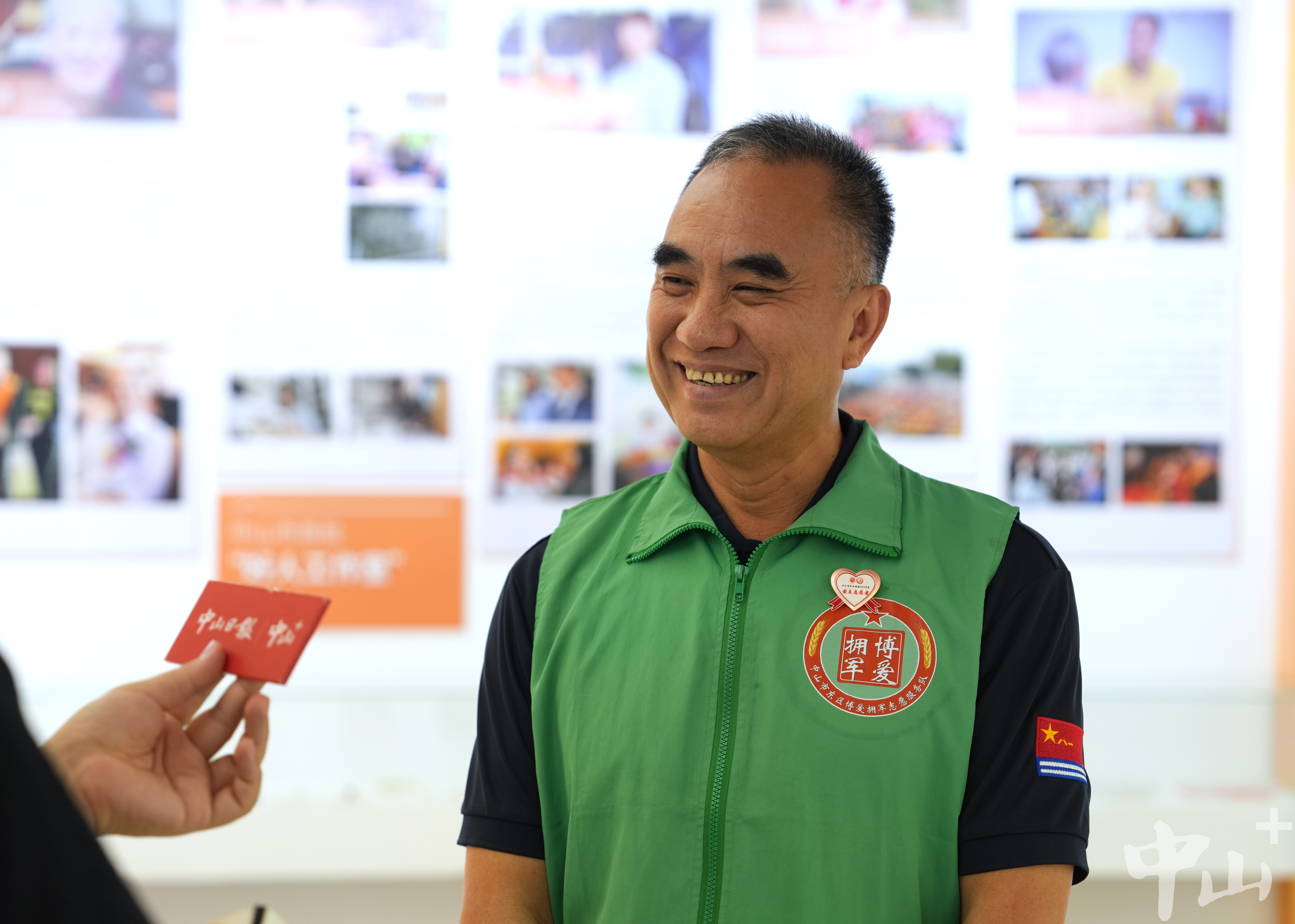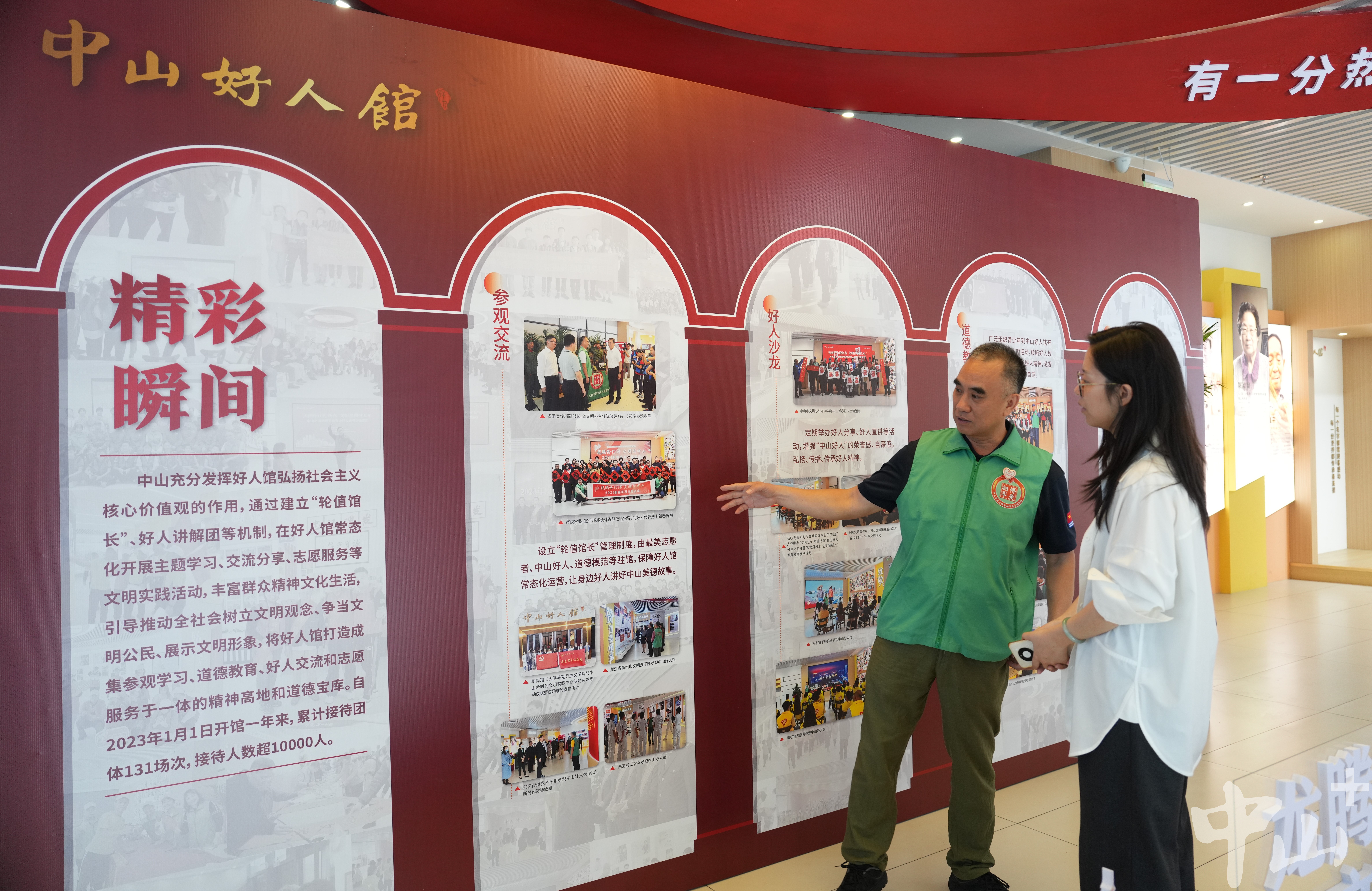 作為一名退伍軍人,李克有很多曾一起在戰(zhàn)場(chǎng)上出生入死的戰(zhàn)友,其中不乏已經(jīng)為國(guó)捐軀的烈士。自2007年起,他便自發(fā)組織尋找犧牲的中山籍戰(zhàn)友,先后6次帶隊(duì)前往廣西邊境的多個(gè)烈士陵園,成功尋到29名犧牲戰(zhàn)友信息,并將相關(guān)信息報(bào)送給中山市退役軍人事務(wù)局。 “我有一位戰(zhàn)友,寧愿把生的希望留給其他人,19歲不到就犧牲在戰(zhàn)場(chǎng)上。他們已經(jīng)離我們而去,更重要的是我們能為他們做些什么。所以逢年過(guò)節(jié)我都會(huì)看望他們的家人,把歡樂(lè)也帶給老人家?!崩羁苏f(shuō)。 2016年,得知戰(zhàn)友的女兒患先天性心臟病,須進(jìn)行心肺聯(lián)合移植手術(shù),李克立即帶頭捐款,并聯(lián)系政府相關(guān)部門和電視臺(tái),通過(guò)媒體報(bào)道讓更多愛(ài)心人士關(guān)注到了這位困難老兵。在他的多方奔走下,社會(huì)各界紛紛伸出援助之手,募集醫(yī)藥費(fèi)40余萬(wàn)元,助戰(zhàn)友的女兒順利完成了手術(shù)。 牽頭成立志愿服務(wù)隊(duì) 延續(xù)志愿精神 作為一名有著30多年志愿服務(wù)經(jīng)歷的資深志愿者,李克的生活已經(jīng)與志愿分不開(kāi)。他的身上始終有一抹綠色:在軍營(yíng),是守衛(wèi)國(guó)門的綠軍裝;在社區(qū),是服務(wù)群眾的綠馬甲。在人民群眾需要的地方,李克每次都沖在最前線。 “2020年疫情暴發(fā)時(shí),很多人都響應(yīng)號(hào)召待在家里,我覺(jué)得作為一個(gè)打過(guò)仗的老兵,我總得站出來(lái)做點(diǎn)事。”沒(méi)有過(guò)多考慮,李克第一時(shí)間加入到了志愿者隊(duì)伍中,并在社區(qū)堅(jiān)守了整整60天。當(dāng)時(shí)防護(hù)物資匱乏,李克還自掏腰包托人在廣州購(gòu)買了6萬(wàn)元左右的防護(hù)物資,全部捐贈(zèng)給了在一線抗疫的工作人員。 近年來(lái),李克還積極捐資助學(xué)、支援災(zāi)區(qū)、扶危濟(jì)困,連續(xù)6年資助6名困難學(xué)生,為汕尾市陸河中學(xué)捐贈(zèng)10套多媒體電腦設(shè)備,堅(jiān)持參與無(wú)償獻(xiàn)血直到60歲。 2018年起,李克擔(dān)任文明城市巡查監(jiān)督員,奔走在街道各個(gè)路口、每條小巷,整理亂停亂放的共享單車,清理“牛皮癬”小廣告,保障街頭巷尾干凈衛(wèi)生。同一年,為更有組織地開(kāi)展志愿活動(dòng),李克牽頭成立了一支以退役軍人為主導(dǎo)的東區(qū)博愛(ài)擁軍志愿服務(wù)隊(duì),把戰(zhàn)友們凝聚在一起,共同為社會(huì)作貢獻(xiàn)。如今,這支志愿服務(wù)隊(duì)已從最初的8名成員,逐漸壯大至400多人,成為服務(wù)社會(huì)的一支生力軍。 講好好人故事,傳承紅色文化 4月19日上午,記者在“中山好人館”見(jiàn)到了正在擔(dān)任“輪值館長(zhǎng)”的李克。從去年1月開(kāi)始,他每個(gè)月都參與輪值,先后為140多場(chǎng)活動(dòng)、1萬(wàn)多名市民群眾義務(wù)講解博愛(ài)之城的凡人善舉、好人大愛(ài)。  正在中山好人館輪值的李克。記者 劉萬(wàn)杰 攝