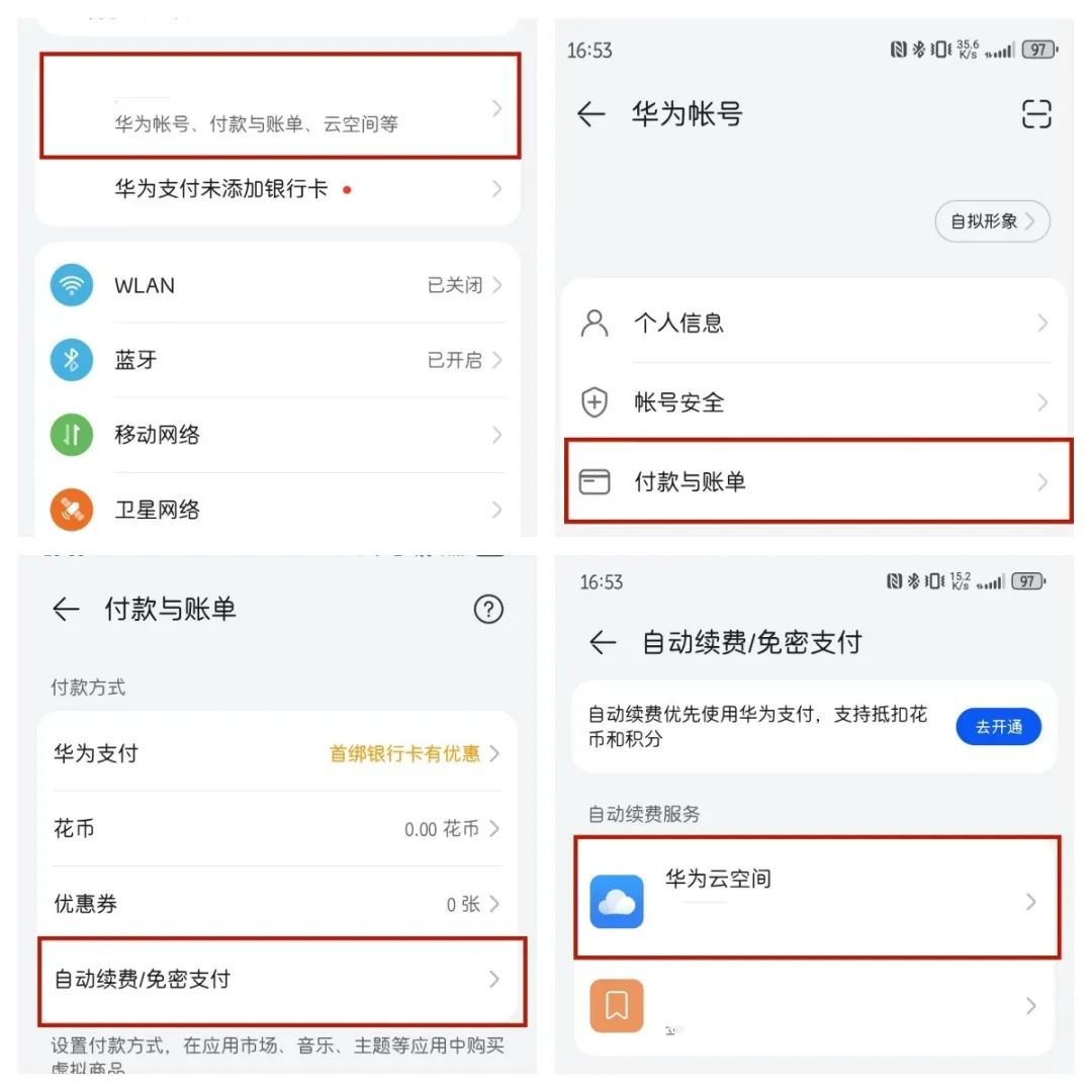 進(jìn)入設(shè)置→華為賬號、付款與賬單、云空間等→付款與賬單→自動續(xù)費(fèi)/免密支付→退訂App業(yè)務(wù)即可。