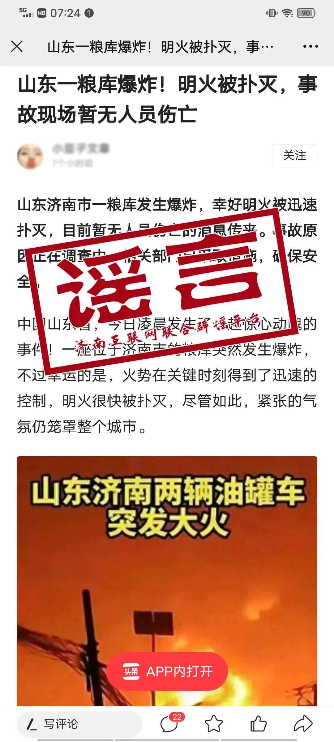 1月20日晚,有網(wǎng)民在社交平臺發(fā)布“山東濟(jì)南市一糧庫發(fā)生爆炸?;饎菰陉P(guān)鍵時刻得到了迅速的控制,明火很快被撲滅,盡管如此,緊張的氣氛仍籠罩整個城市”消息,所配圖片顯示為“濟(jì)南兩輛油罐車突發(fā)大火”,引發(fā)了網(wǎng)友熱議。