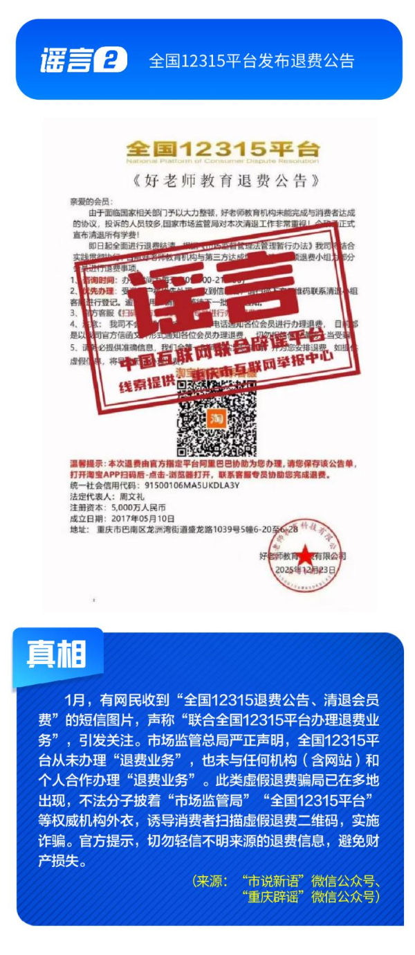 公共政策領(lǐng)域謠言誤導(dǎo)公眾決策?!吧绫?]有有效期限制、未到期不能換新卡”是對社??ü芾碚叩恼`讀,給民眾平添困擾;“28家博物館元旦期間閉館”實(shí)為少數(shù)博物館根據(jù)運(yùn)營安排所做的微調(diào),網(wǎng)帖嚴(yán)重夸大實(shí)際閉館情況,引發(fā)負(fù)面炒作;“深圳有望推行12年義務(wù)教育,高中免費(fèi)”是對現(xiàn)行政策的“超前編造”,誤導(dǎo)學(xué)生及家長群體;“全國12315平臺發(fā)布退費(fèi)公告”,則是假冒監(jiān)管機(jī)構(gòu)名義散播不實(shí)通知,為后續(xù)詐騙行為做鋪墊。