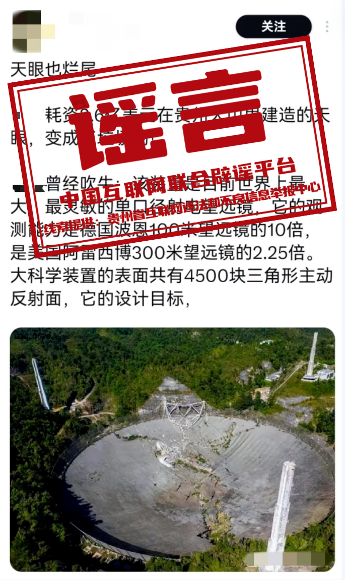 真相:近日,海外社交平臺(tái)有網(wǎng)民發(fā)布一張圖片,聲稱“耗資2.6億美元在貴州大山里建造的天眼,變成了垃圾場!”對此,“貴州辟謠”官方微信公眾號發(fā)布消息稱,網(wǎng)傳說法為謠傳,網(wǎng)傳圖片實(shí)為美國波多黎各的阿雷西博天文臺(tái)(Arecibo Observatory)于2020年12月發(fā)生徹底坍塌的畫面,該天文臺(tái)主要的觀測裝置為阿雷西博射電望遠(yuǎn)鏡。事實(shí)上,這并非“中國天眼”第一次“被坍塌”,2020年阿雷西博望遠(yuǎn)鏡第一次出現(xiàn)嚴(yán)重?fù)p壞之際,網(wǎng)絡(luò)中就曾出現(xiàn)過類似謠言。