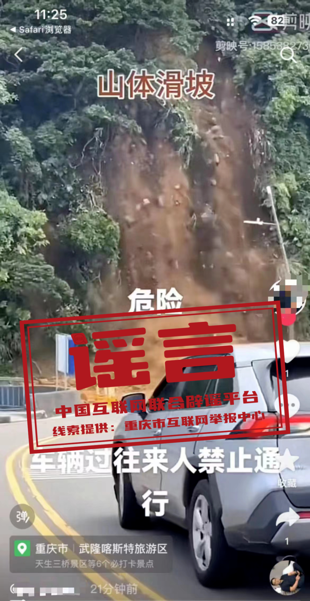 真相:近日,有網(wǎng)民發(fā)布了一則“山體滑坡危險(xiǎn),過(guò)往車輛行人禁止通行”的視頻,視頻定位標(biāo)注為“重慶市武隆喀斯特旅游區(qū)”。經(jīng)重慶市武隆區(qū)多部門核實(shí),該區(qū)近期未發(fā)生大面積山體滑坡事件。網(wǎng)傳視頻實(shí)為2024年6月3日臺(tái)灣省基隆市中正區(qū)潮境公園入口發(fā)生的大規(guī)模山體滑坡事件,而視頻中所標(biāo)注的定位信息系網(wǎng)民發(fā)布視頻的地點(diǎn),而非事件發(fā)生的地點(diǎn)。(來(lái)源:“重慶辟謠”微信公眾號(hào)、網(wǎng)信武隆)