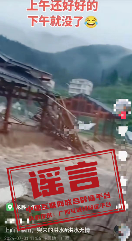詳情:近日,有網(wǎng)民發(fā)布視頻稱“桂林龍勝一風(fēng)雨橋被洪水沖毀”,并配文“上午還好好的,下午就沒了”,引發(fā)關(guān)注。經(jīng)當(dāng)?shù)毓膊块T核實(shí),偉江鄉(xiāng)轄區(qū)內(nèi)風(fēng)雨橋完好無(wú)損,不存在倒塌的情況。該視頻系當(dāng)?shù)鼐W(wǎng)民龍某某罔顧事實(shí)、故意編造,將網(wǎng)上看到的其他地方的風(fēng)雨橋被毀視頻重新編輯并定位在偉江鄉(xiāng)進(jìn)行發(fā)布。目前,警方已依法對(duì)龍某某予以行政處罰。(來(lái)源:廣西互聯(lián)網(wǎng)辟謠平臺(tái)、龍勝公安)