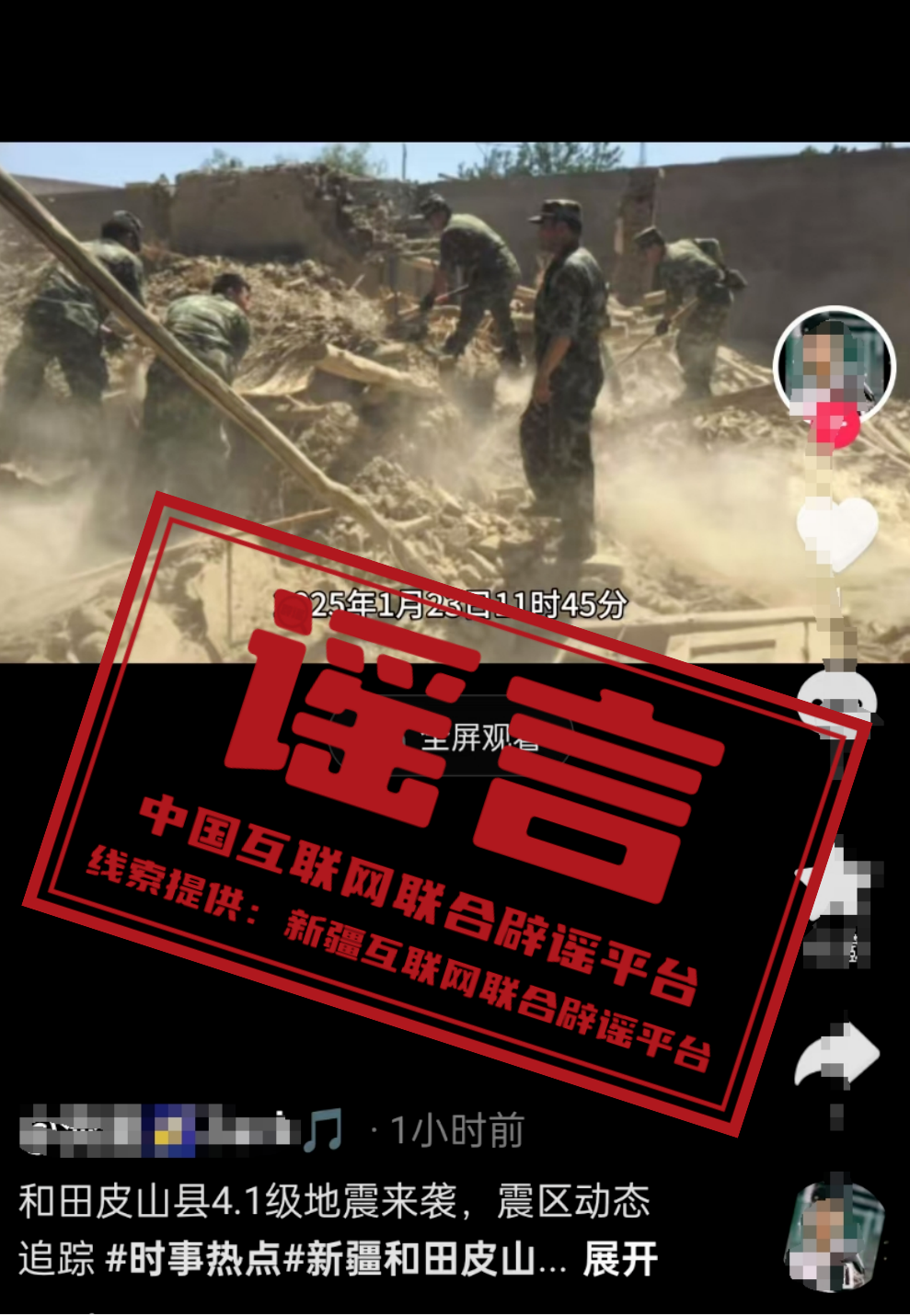真相:中國地震臺網(wǎng)正式測定,2025年01月23日11時45分在新疆皮山縣(緯度36.94°,經(jīng)度78.87°)發(fā)生4.1級地震,震源深度15公里,震中附近地形類型為山地,5公里范圍內(nèi)平均海拔高度為2484米,距離皮山縣92公里。個別網(wǎng)民關(guān)聯(lián)此次地震,發(fā)布“房屋倒塌、道路坍塌及應(yīng)急救援”等謠言圖片和短視頻,博取流量誤導(dǎo)網(wǎng)民。經(jīng)皮山縣應(yīng)急管理局核實,此次地震未造成人員傷亡及財產(chǎn)損失。對編造散布地震謠言擾亂公共秩序、造成惡劣社會影響的行為,公安機關(guān)將依法依規(guī)嚴肅查處。請廣大網(wǎng)民擦亮眼睛,勿輕信傳播非正規(guī)來源、未經(jīng)證實的地震信息。(來源:新疆網(wǎng)絡(luò)辟謠)